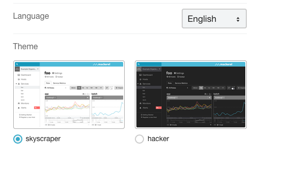 画面右上のユーザアイコンをクリックしていただき、[アカウント設定] - [ユーザインターフェース]にてテーマ設定が可能です(https://mackerel.io/settings/user)。 従来のMackerelのテーマ名が"skyscraper"、ハッカーモードが"hacker"となります。カラーテーマのさらなる追加も予定しておりますので、お楽しみに。