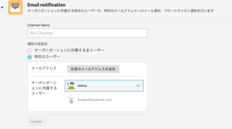 今回のアップデートにより、メールの通知チャンネルの設定において、オーガニゼーションのメンバーの中から任意の送信先を選択したり、また完全に任意のメールアドレスを送信対象に加えることができるようになりました。