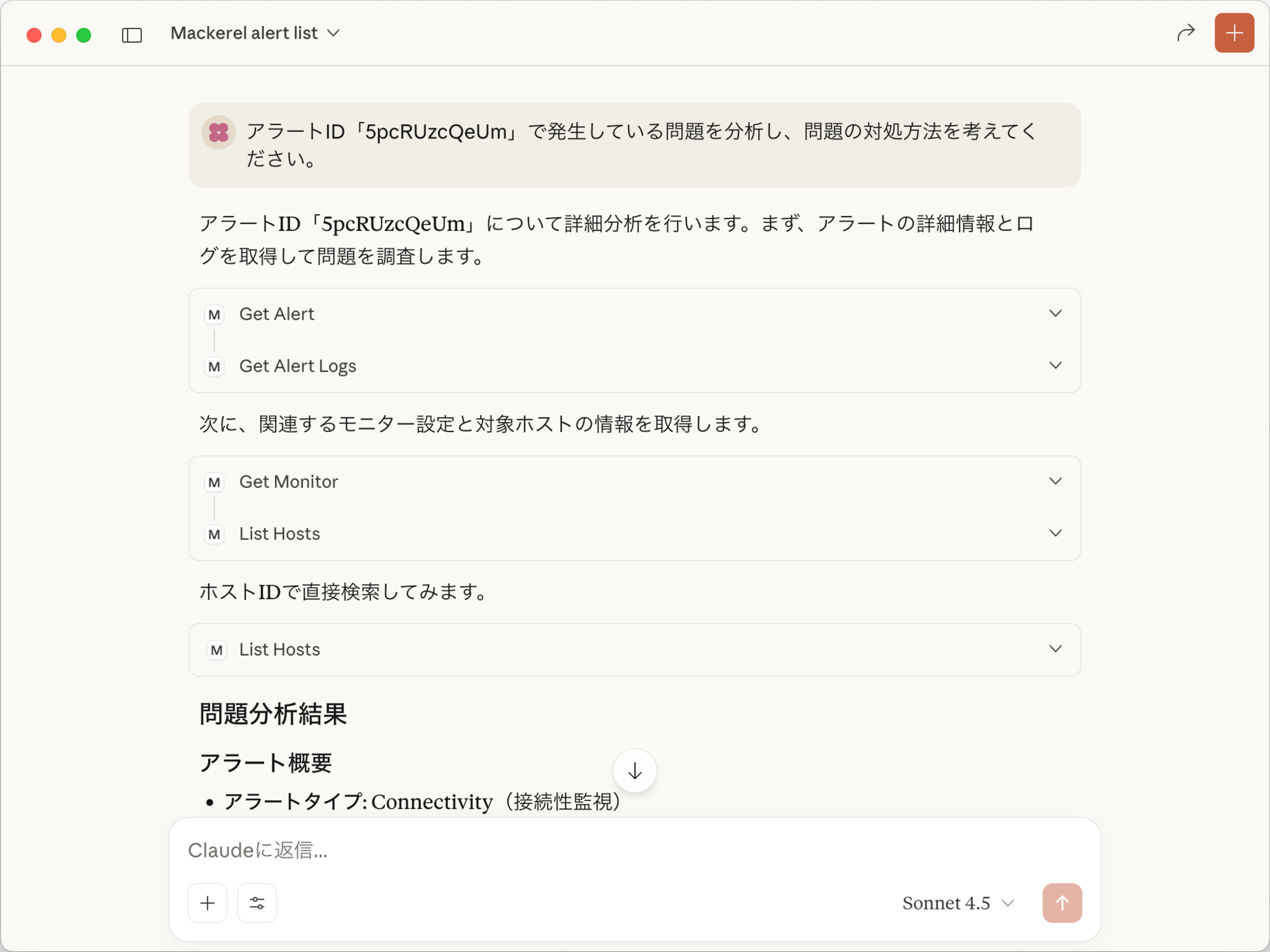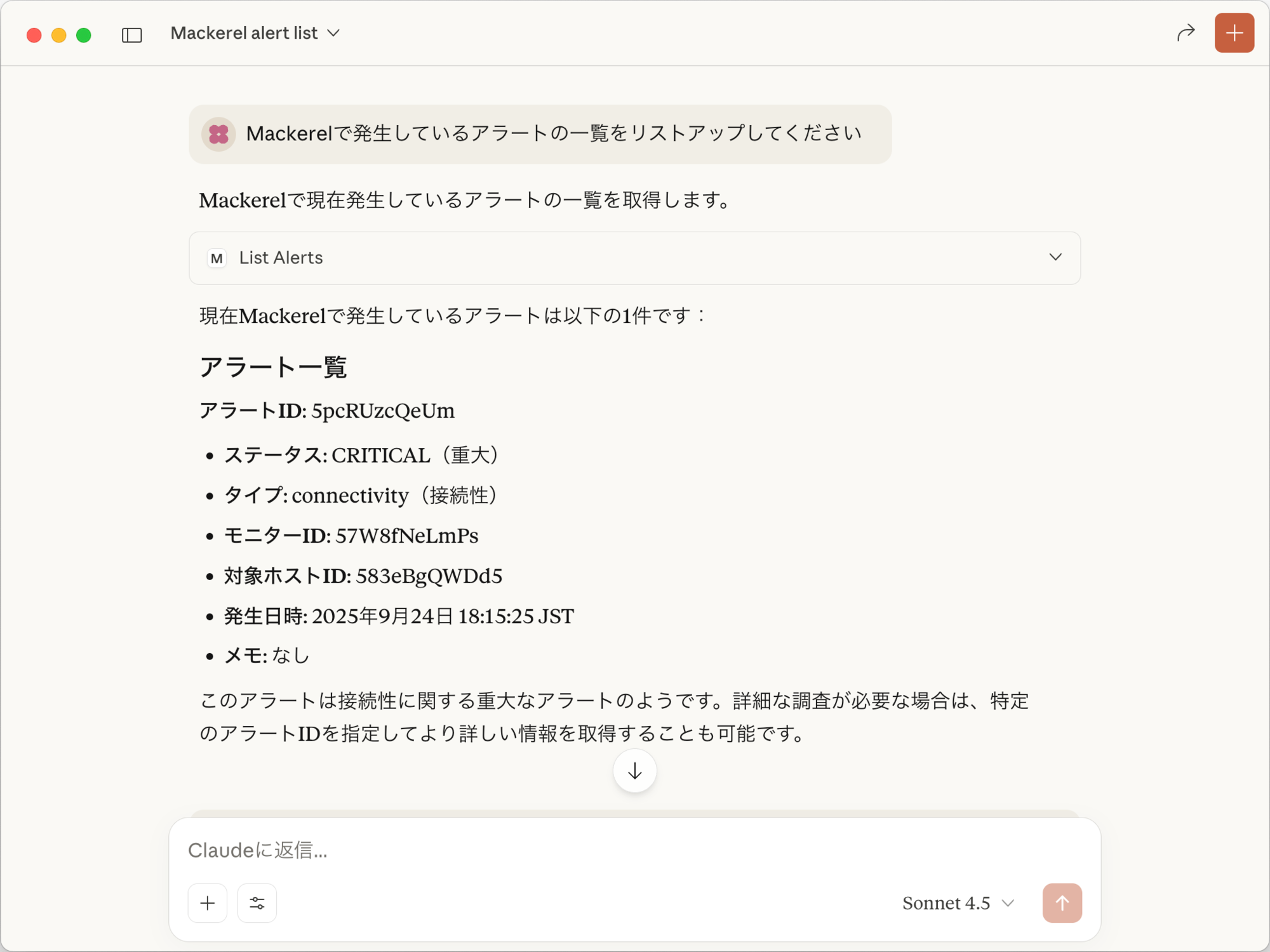 」というプロンプトを渡すと、Mackerel上で発生しているアラートの一覧をClaudeが取得し、人間にとって読みやすい形で出力してくれます。
