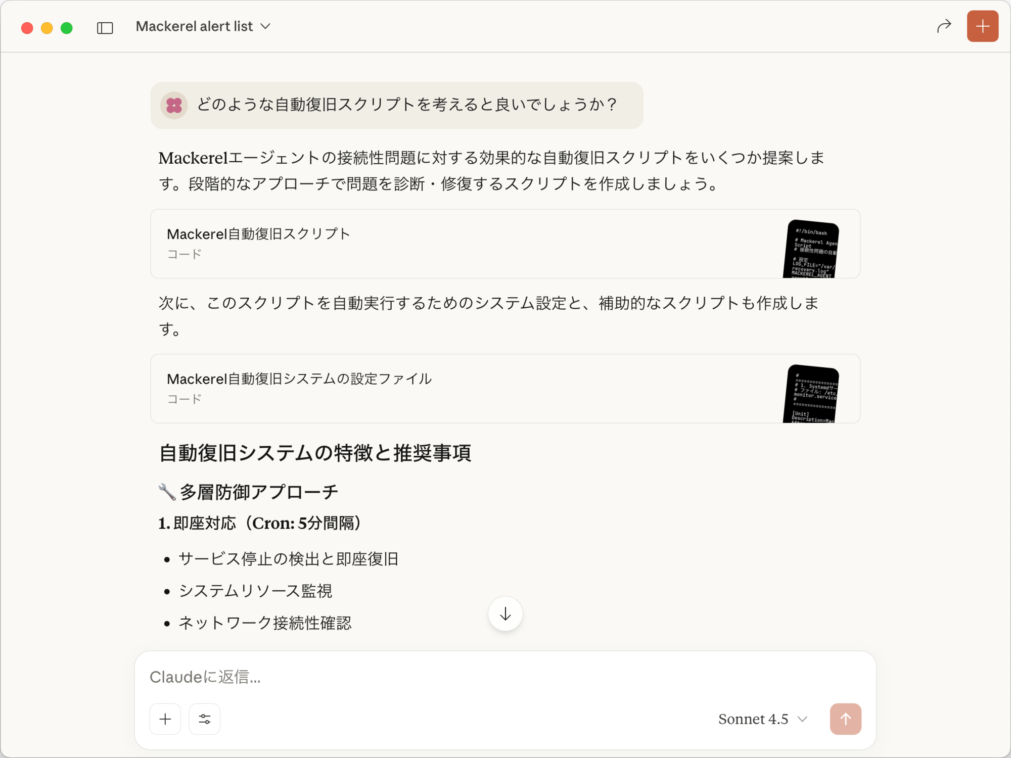 Mackerelでアラートが発生しているとき、Claudeに解決策を相談できます。