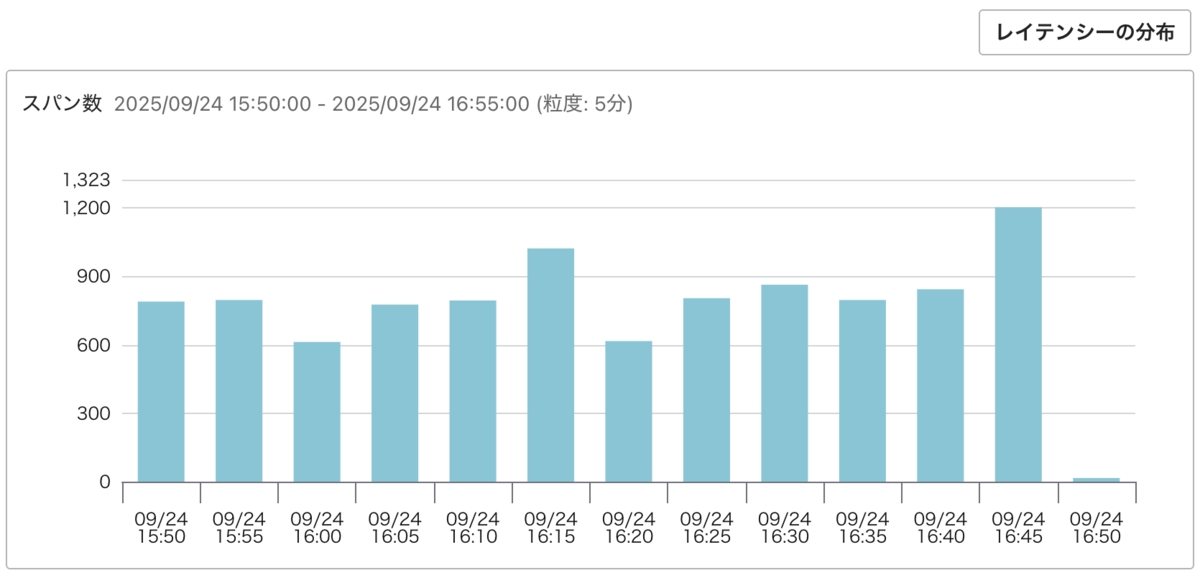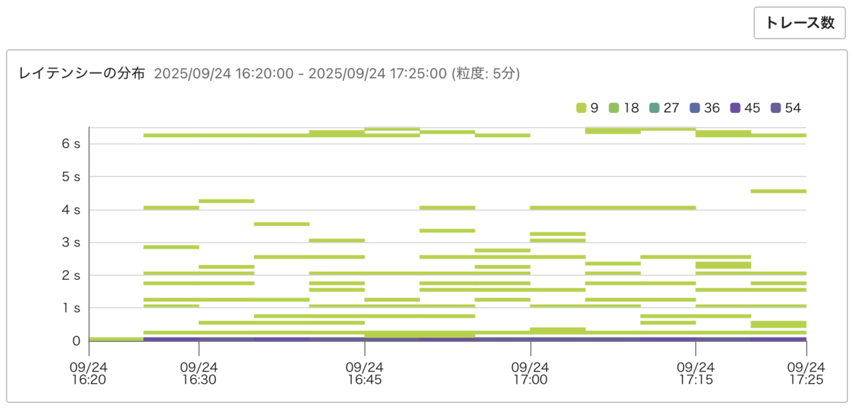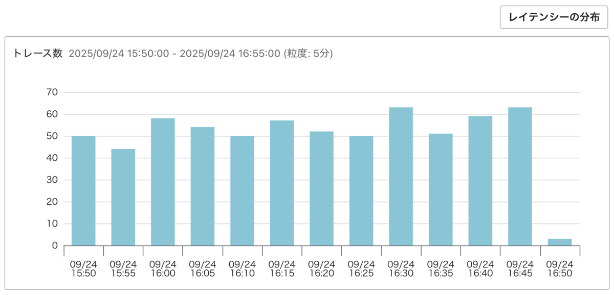 トレースタブはデフォルトではレイテンシーの分布(ヒストグラム)が表示されますが、右上の「トレース数」ボタンをクリックすることで、トレースの投稿数のグラフに切り替えられるようになりました。トレースの投稿数の推移を見ることで、リクエストの推移を知るのに役立ちます。