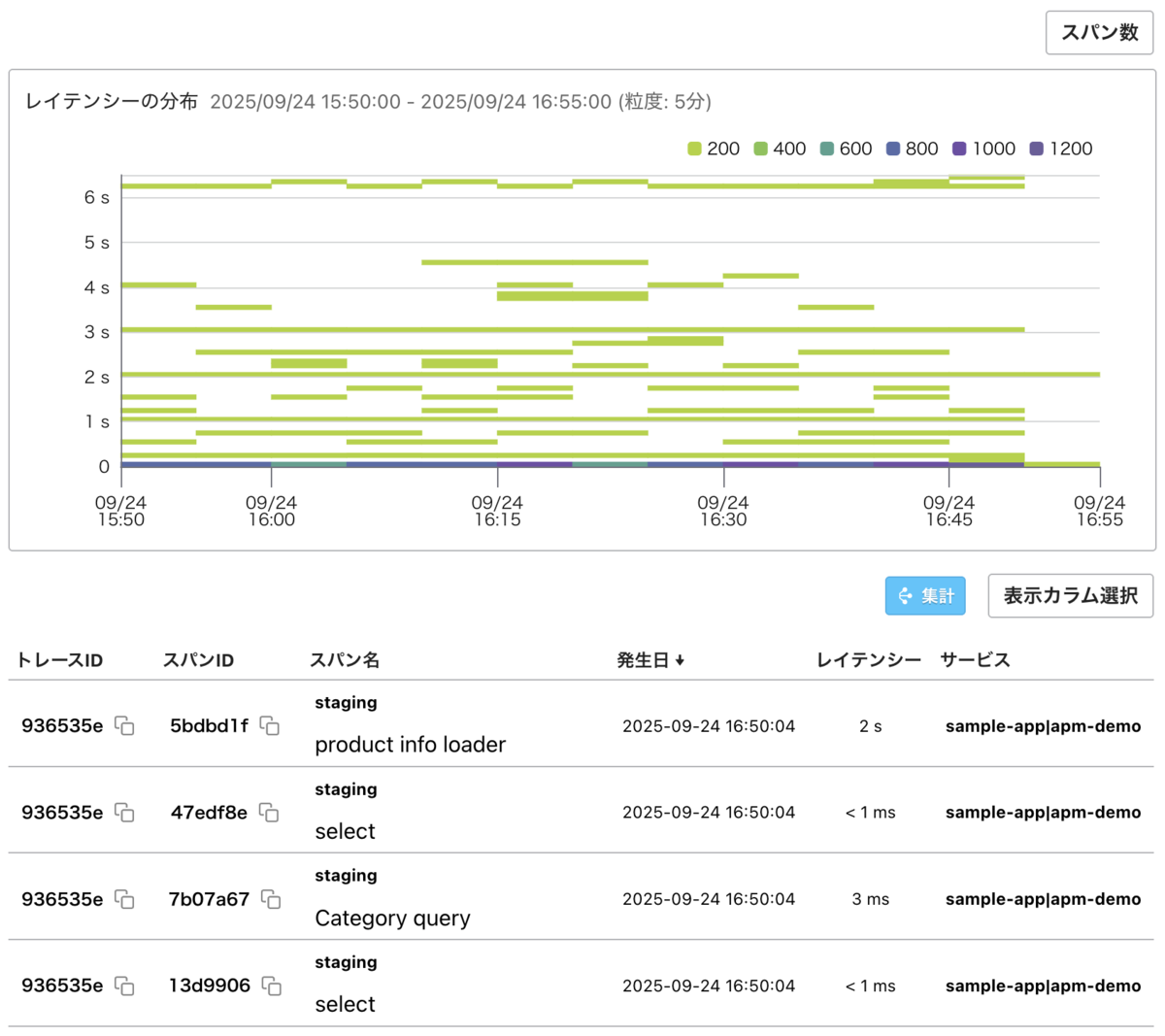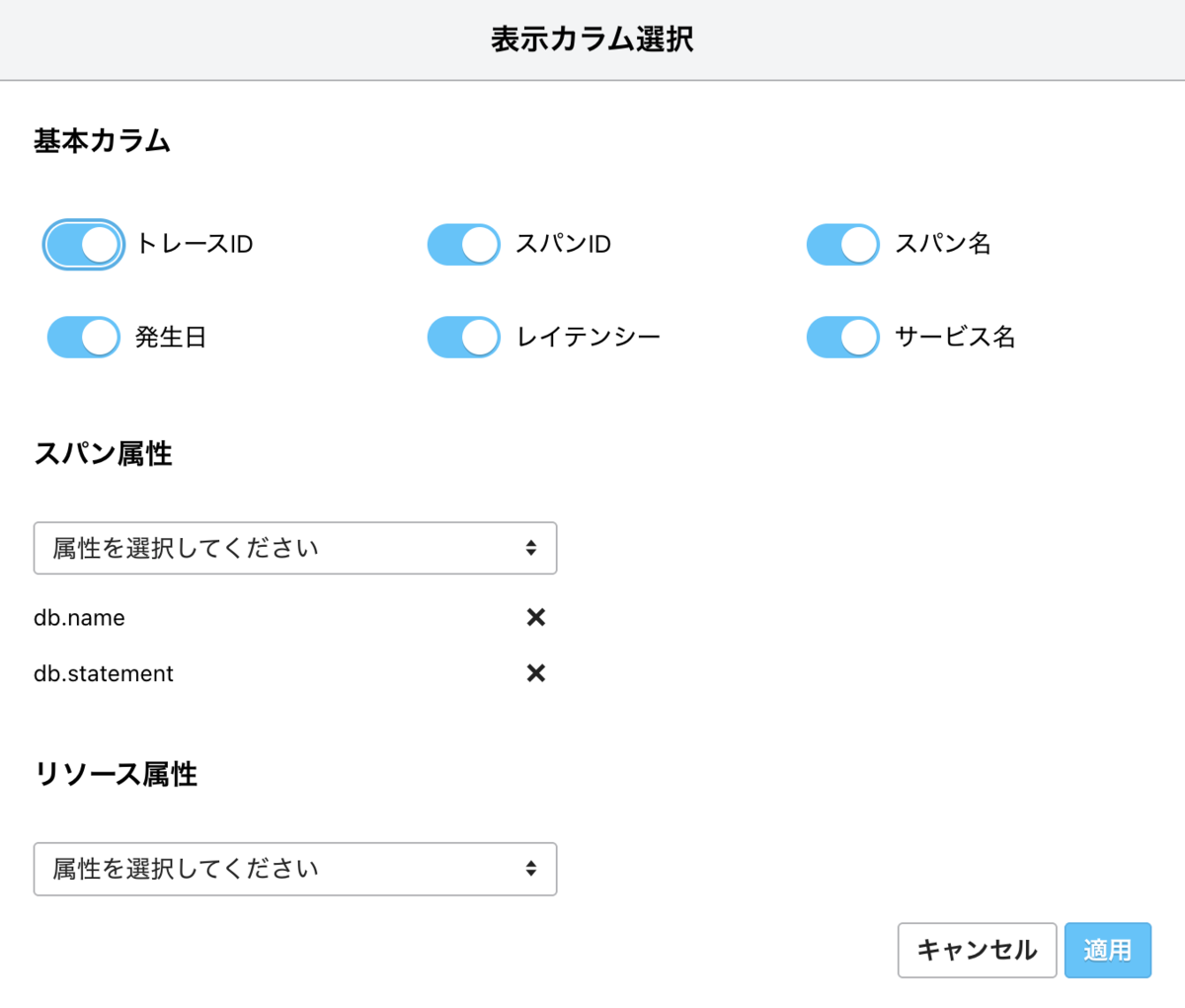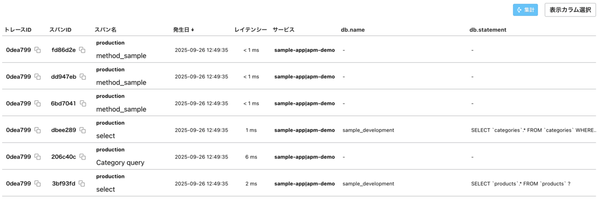 スパン一覧では、一覧の右上にある「表示カラム選択」ボタンから、カラムの表示・非表示を切り替えたり、任意の属性値をカラムに追加したりできます。たとえばデータベースのクエリの内容を確認しながらスパンの探索を行うことができます。