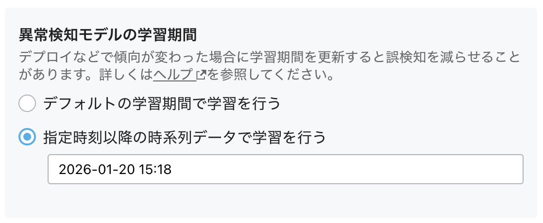 - 異常検知モデルの学習期間: 異常検知モデルは過去(数十日程度)のメトリックから傾向を学習します。デプロイなどでメトリックの傾向が変わった場合(例: パフォーマンス改善を行なったため、CPU使用率が下がった)、学習期間を変更すると誤検知を減らせる場合があります。学習期間は以下の3つから選択できます