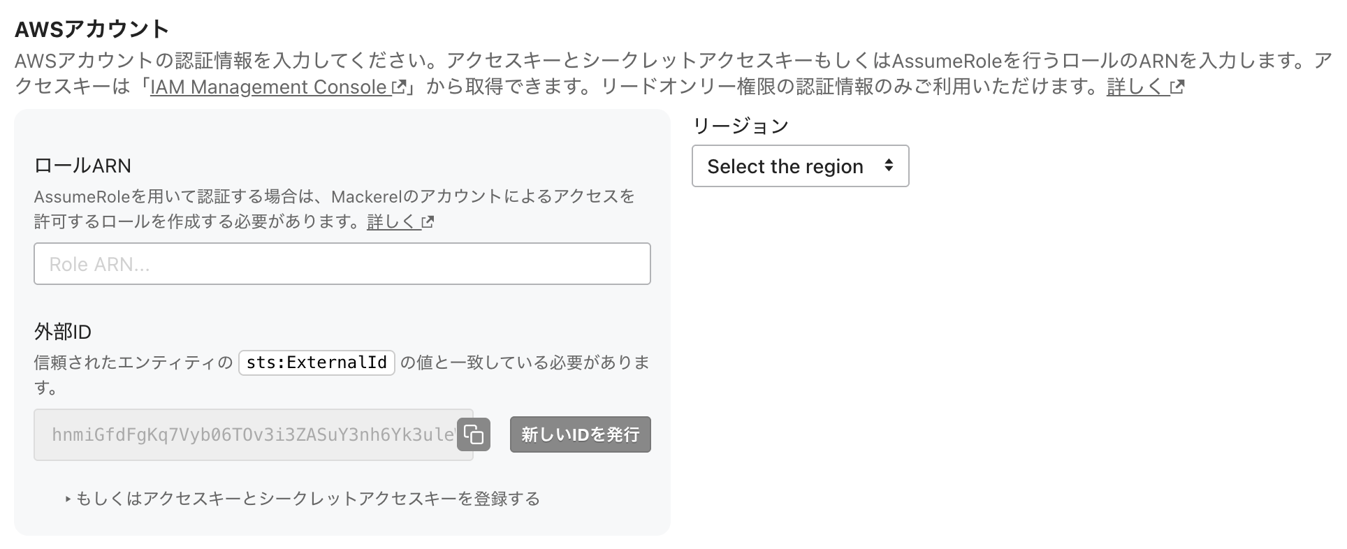 ⚠️ 外部IDは画面を閉じると値が変わってしまうため、AWSインテグレーションの設定が完了するまでは、画面を閉じないでください。